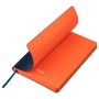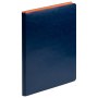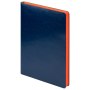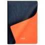 На ощупь поверхность гладкая, глянцевая, фактурно ощущается характерный для кожи мелкий рельеф. Не образует заломов, не расслаивается. Цвет обложки – темно-синий, глубокий, насыщенный, однородный. Тон за счет фактуры может меняться в зависимости от освещения. Цвет матовых форзаца и нахзаца – сочный оранжевый. Ярко контрастирует с обложкой. Срез матовый, выполнен в тон форзаца и нахзаца.