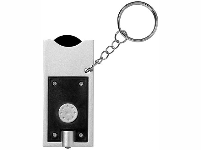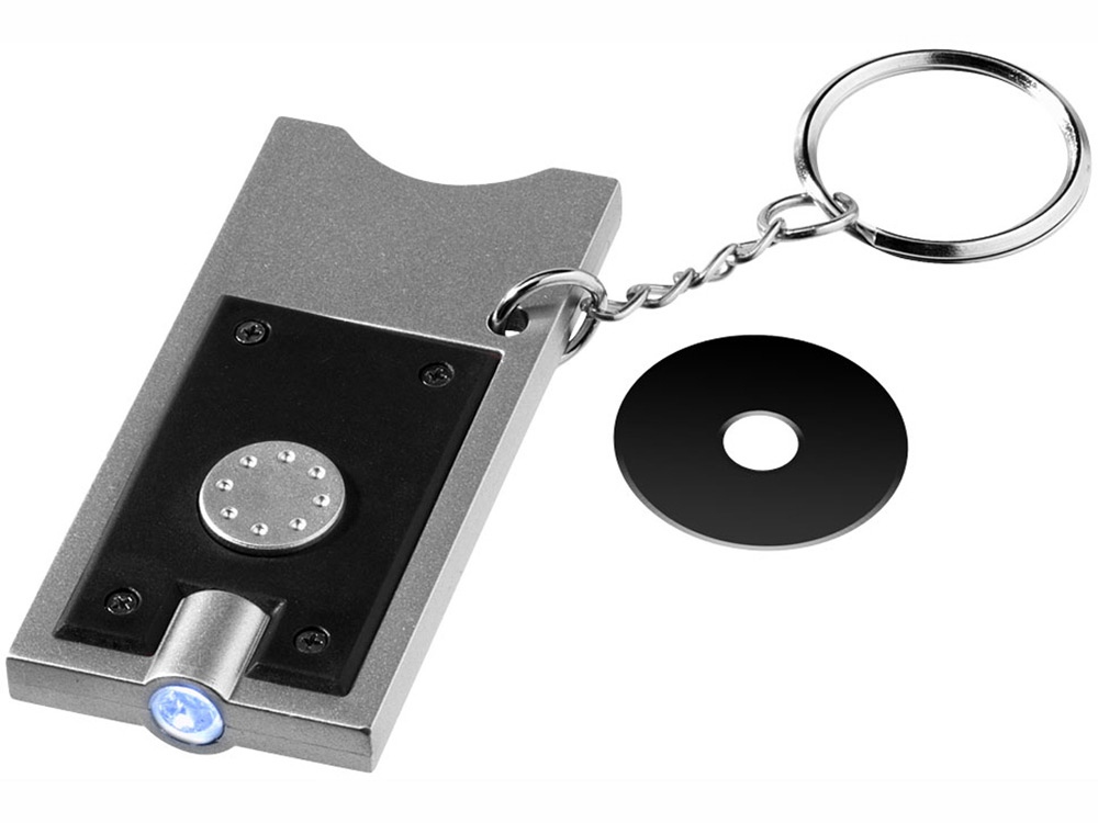 Пластиковый держатель для монет достоинством 1 евро размером ? 6 мм с одним белым светодиодом для ключей. Металлическое кольцо для ключей ? 25 мм.