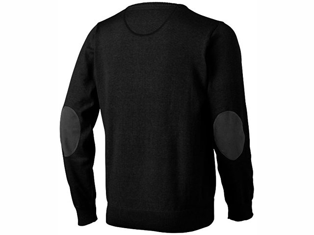 Мужской пуловер Spruce с V-образным вырезом. Резинка 1х1 на воротнике, манжетах и на поясе. Саржевые заплаты на локтях в антрацитовом цвете. Принт лого сзади в тон изделия. Внутри антрацитовый полумесяц из твила. Атласная лента внутри горловины.