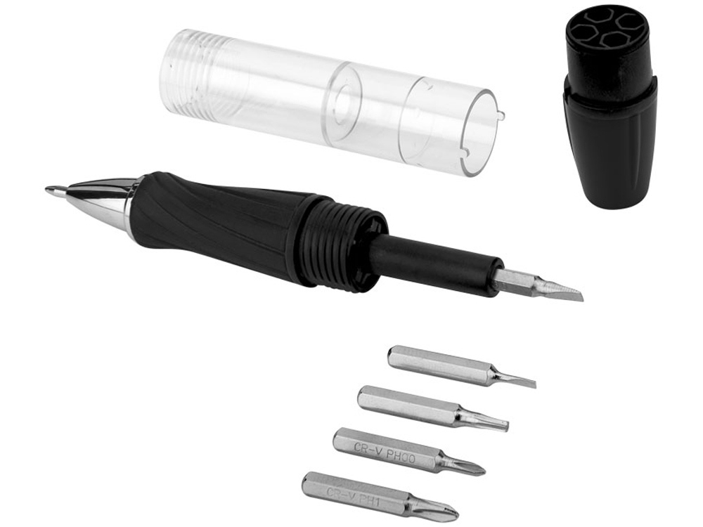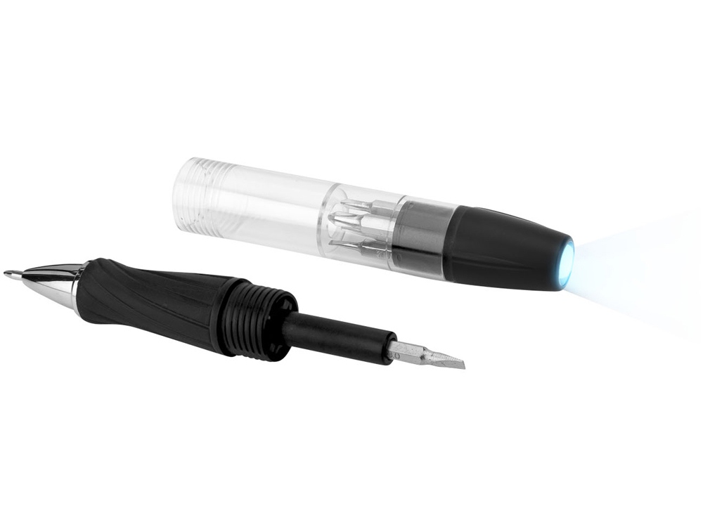 Инструмент King 7-ми функциональный с ручкой и фонариком. Шариковая ручка с поворотным механизмом, корпус- холдер для 5-ти насадок отверток. Диодный фонарик с поворотным включением. Батарейки в комплекте. АБС пластик.