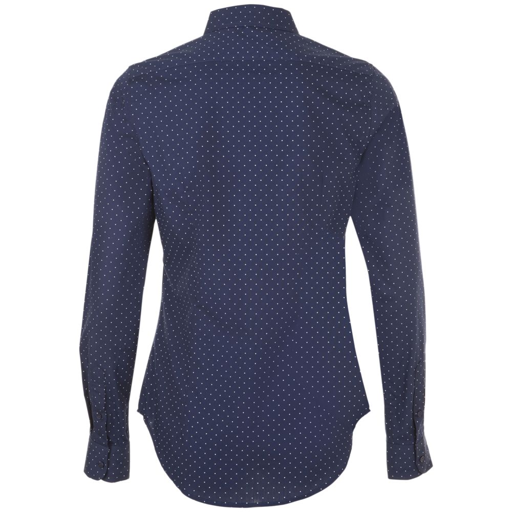 Модная рубашка с печатным рисунком в горошек, которая прекрасно впишется в современный корпоративный стиль.Приталенная модель с нагрудными вытачками, маленьким классическим воротничком, планкой с 7 пуговицами тон в тон и манжетами на 1 пуговице с разрезом «капуцин».