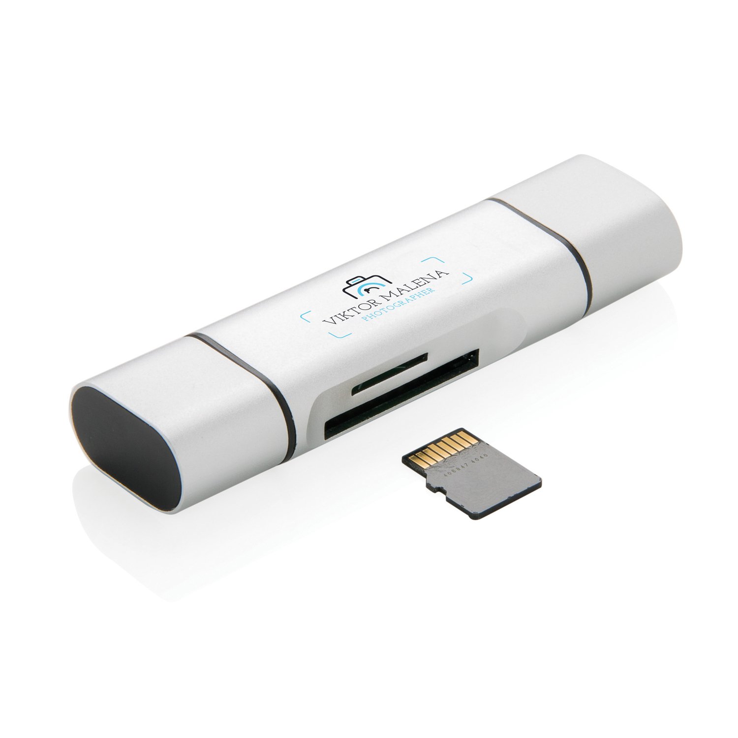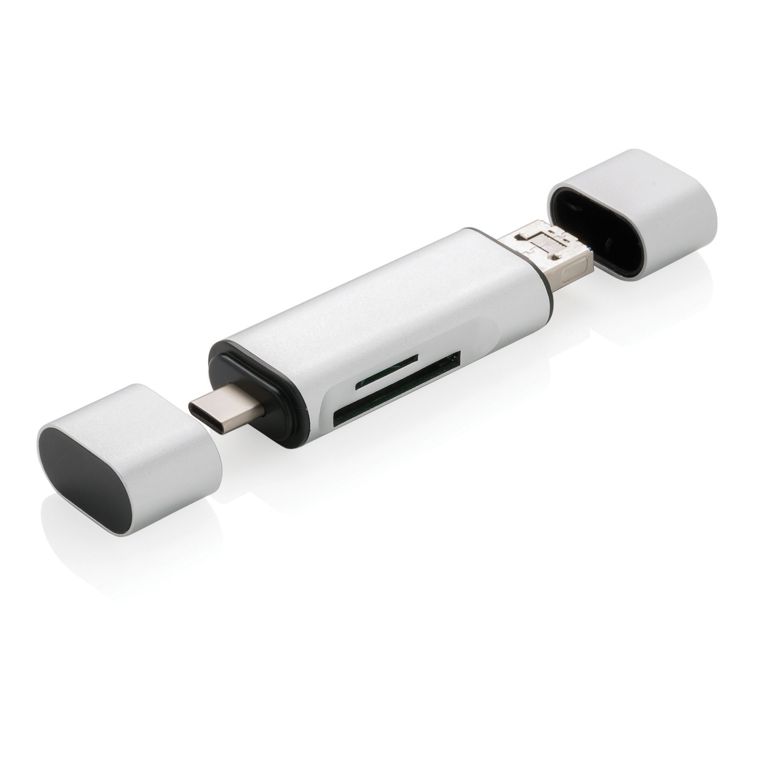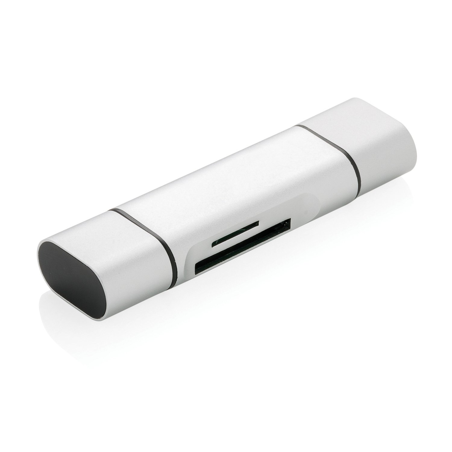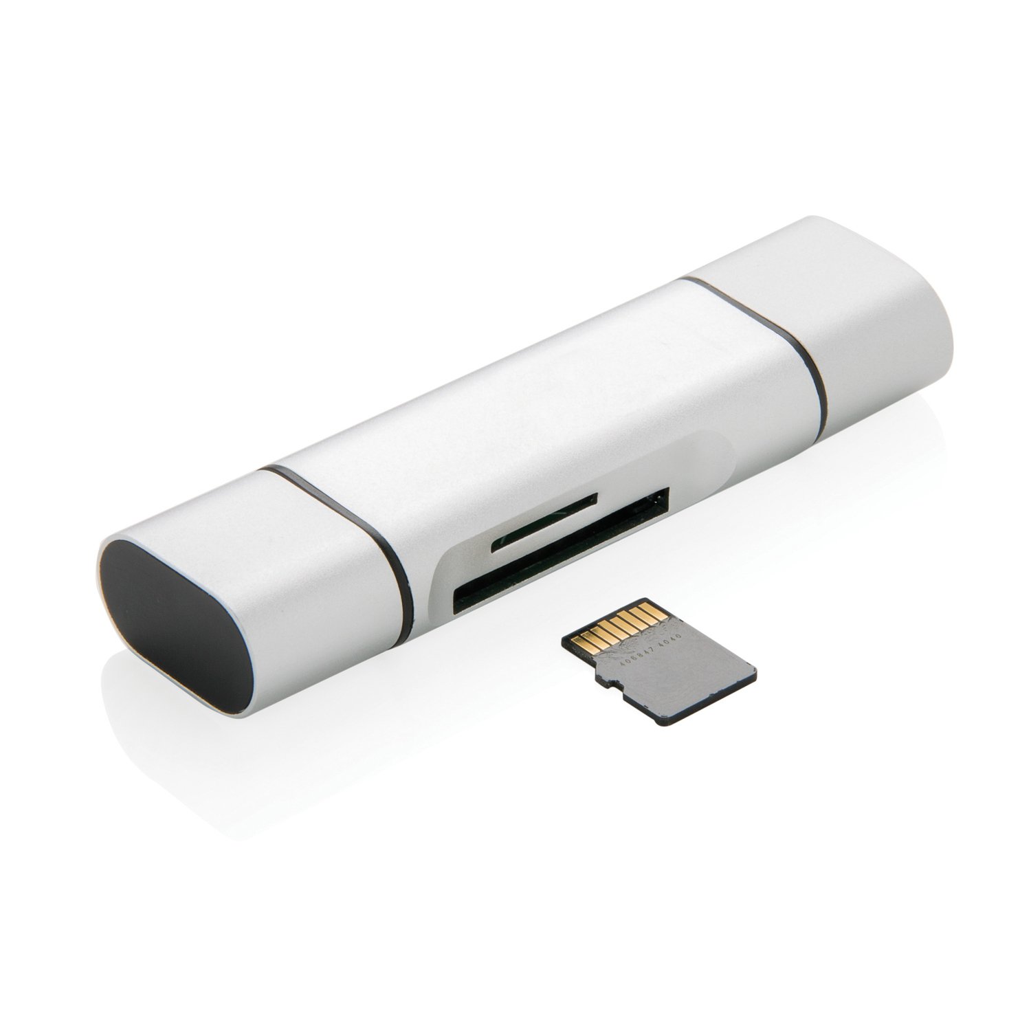 Универсальный картридер изготовлен из прочного алюминия. Он подходит для карт SD и micro-SD. На картридере два выхода: USB 2.0 и Type-C, а также в комплекте идет кабель OTG, добавляющий выход micro-USB. А это значит, что с помощью данного аксессуара доступ к данным можно получить не только с компьютера, но еще и с планшета или смартфона.
