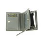 Кошелёк состоит из двух отделений. Первое отделение закрывается на кнопку, включает в себя: два отделения для купюр, три отделения для кредитных карт, одно отделение с прозрачным окошком, два скрытых боковых кармана. Второе отделение закрывается на молнию, разделяется перегородкой и предназначено для мелочи.