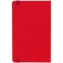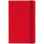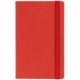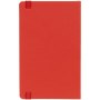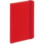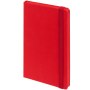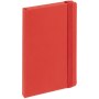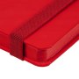 Блокнот в твердой обложки, выполнен из материала Soft Touch Ultra, красный РР, дополнен резинкой и ляссе в цвет обложки.