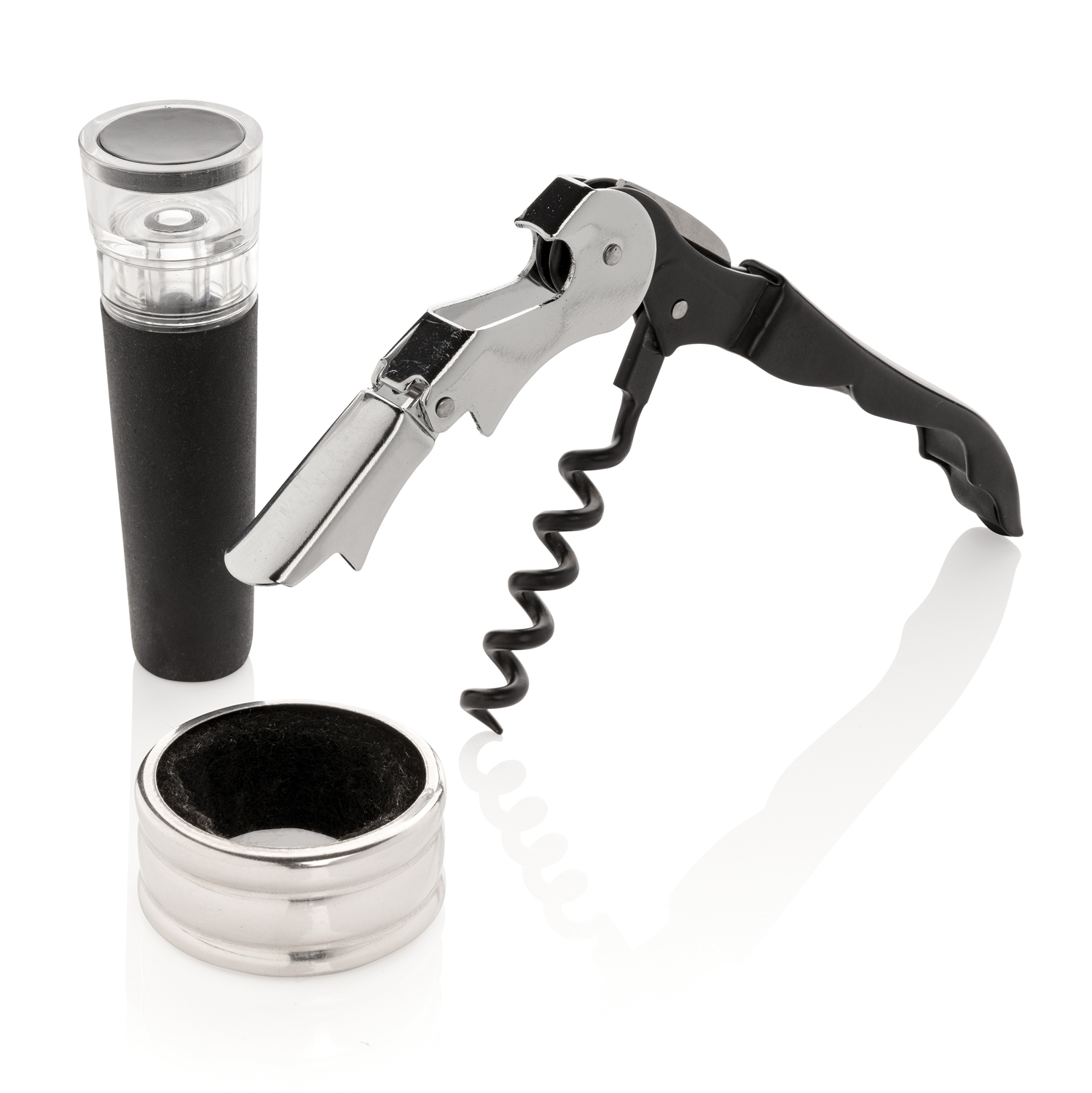 Все, что вам нужно для подачи ваших любимых вин, собрано в этом наборе. В комплект входят профессиональный штопор, обрезатель фольги и кольцо-каплеуловитель. Набор упакован в красивую подарочную коробку.