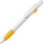 Аксессуары выполнены в белом пластиковом корпусе, оснащенном всеми базовыми элементами: широким овальным клипом, яркой резиновой накладкой в зоне грифа, кнопкой. Такие ручки идеальны для нанесения рекламной информации. Печать может осуществляться как на корпусе, так и на клипе. Обратите внимание, как удобно держать в руке такие пишущие инструменты. Прорезиненный гриф не дает пластику скользить в Вашей ладони, а значит, на письмо можно затрачивать меньше усилий!