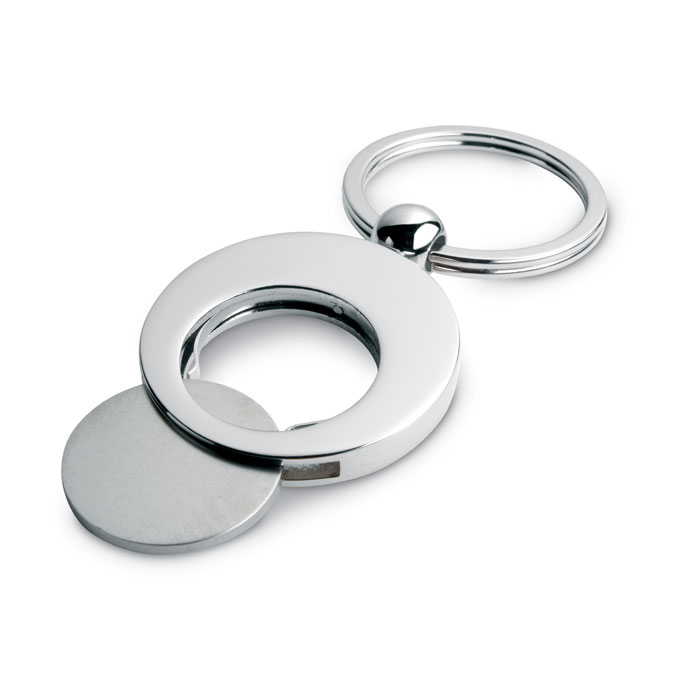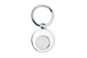 Круглый металлический брелок для ключей с отверстием, чтобы вставить монету в 1 Евро, либо жетон.