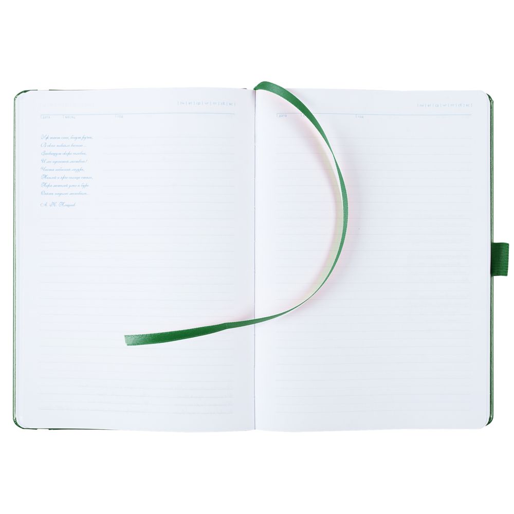 Ежедневник выполнен из материала Nebraska, дополнен резинкой, петлей для ручки и лентой-ляссе.