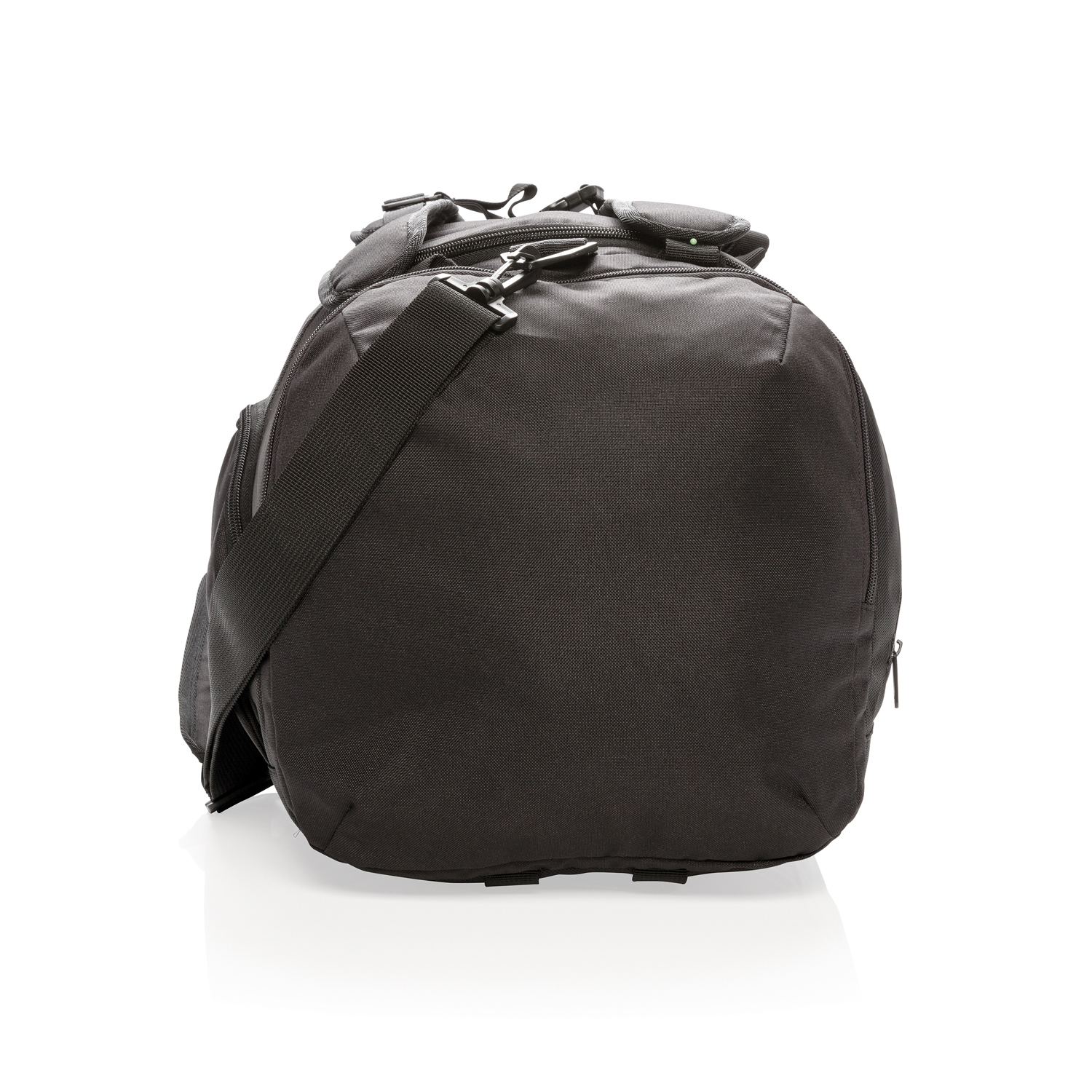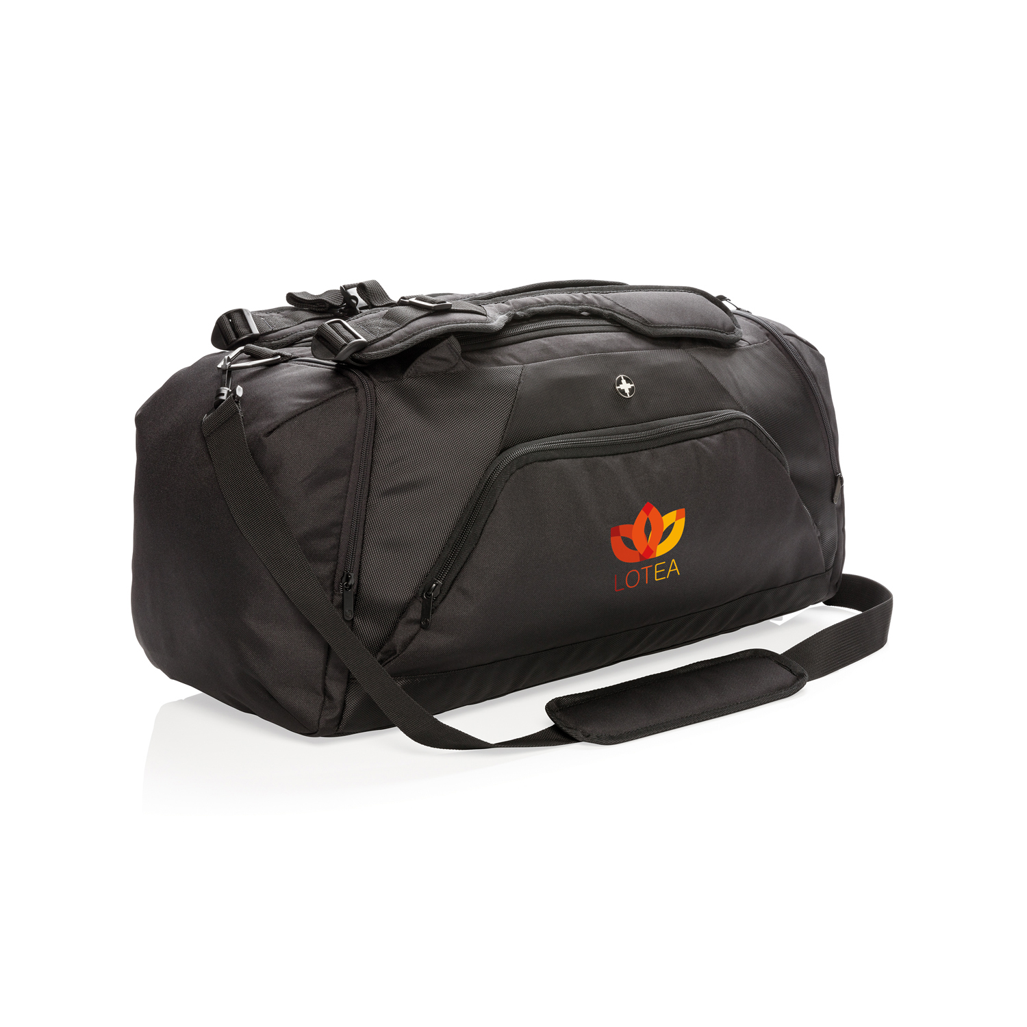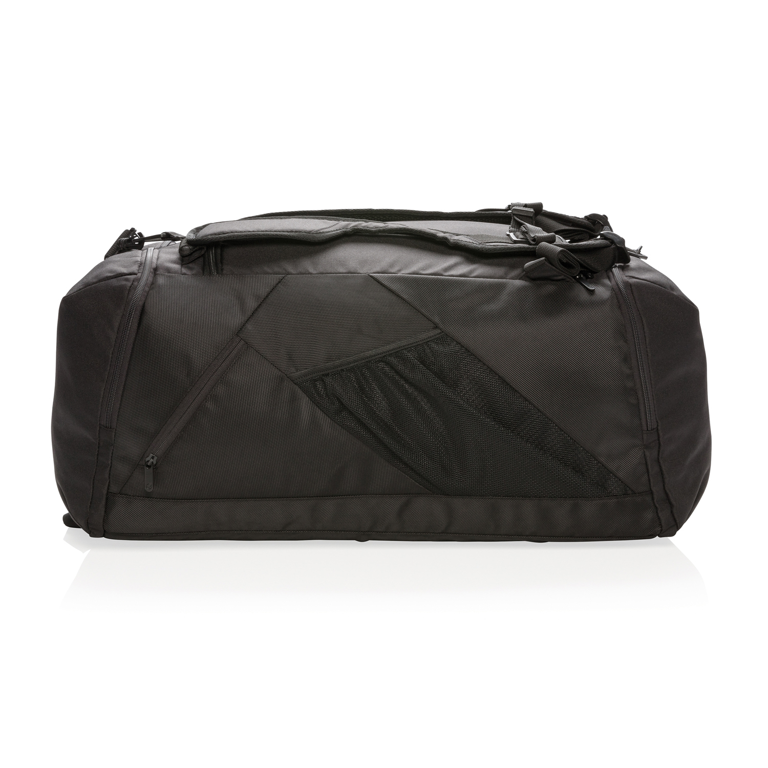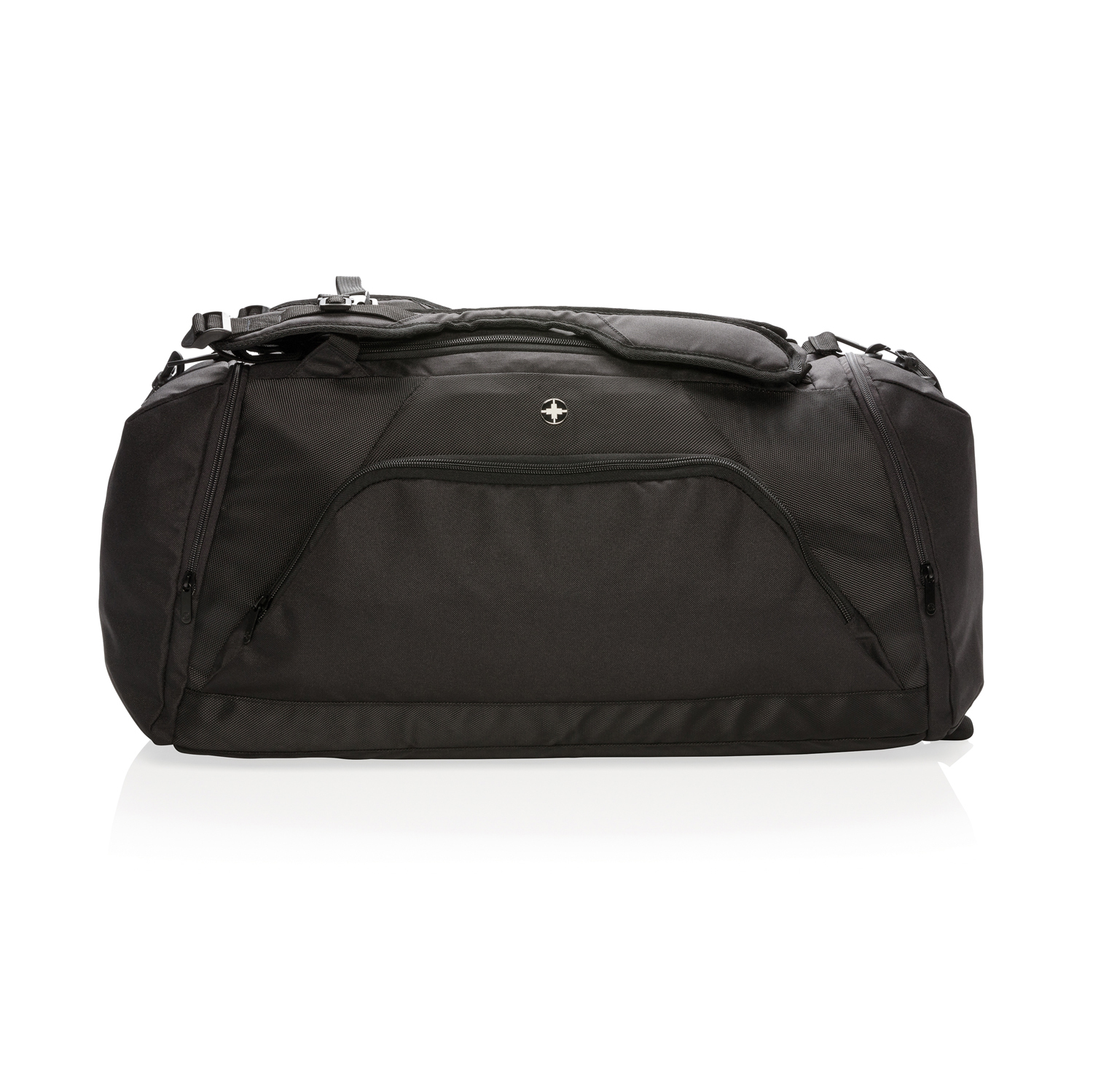 Сумка 2-в-1 из легкого полиэстера плотностью 1680D и 600D. Может использоваться и как рюкзак, и как спортивная сумка. Имеет просторное основное отделение с U-образной верхней застежкой-молнией, боковое отделение для обуви или грязной одежды и боковой карман на молнии. С задней части расположена сетка-держатель для бутылки с водой и удобный кармашек быстрого доступа. В передней части – карман на молнии с двумя отделениями с RFID защитой от считывания данных. Регулируемые плечевые ремни для удобства и функциональности. Материал не содержит ПВХ.