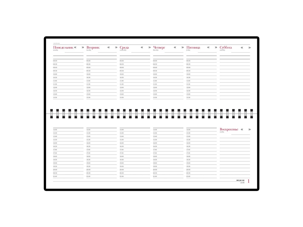 Недатированный планинг выпускается размером 305*130 мм и содержит 208 страниц (блок 295х100 мм). Для них выбрана высококачественная белая мелованная бумага плотностью 70 грамм. Разворот представляет собой разметку на 7 дней недели с графами с указанием времени. Первые 15 страниц содержат справочные сведения из различных областей. Крепление листов на открытом гребне способствует быстрому переходу по страницам.