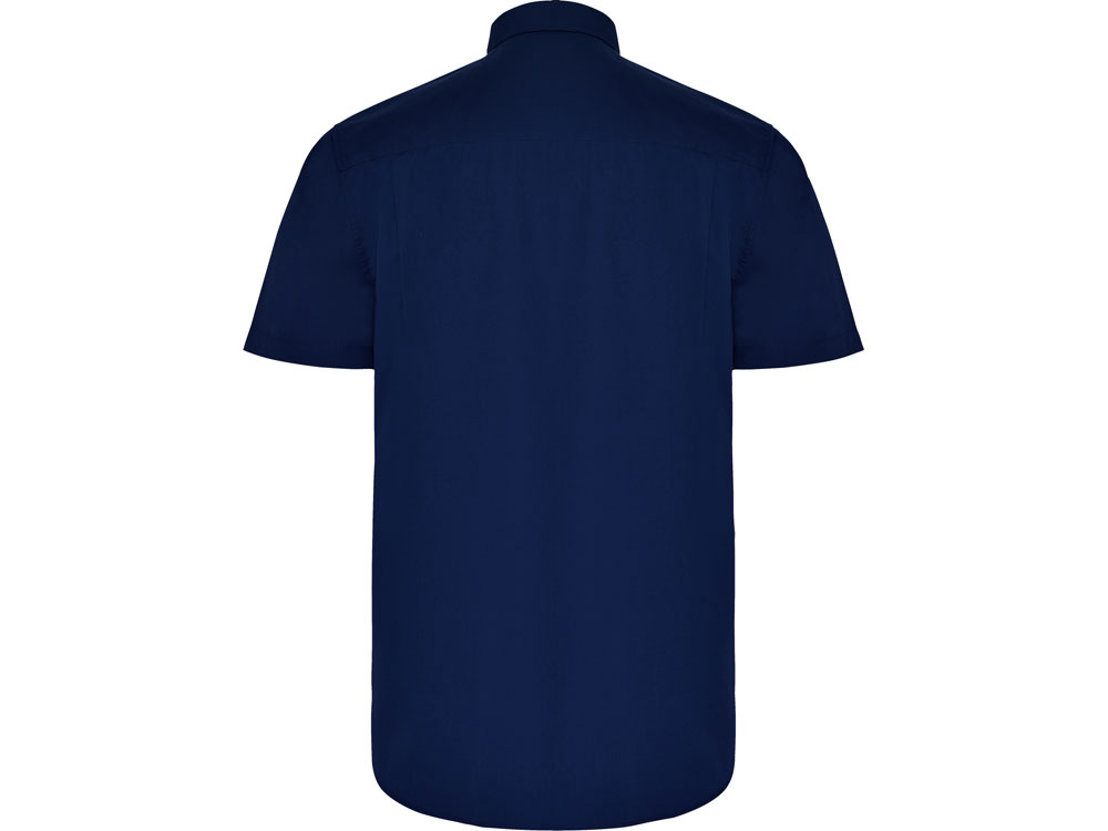 Рубашка мужская с коротким рукавом на семи пуговицах. Накладной карман на груди слева, закругленный низ изделия. Уголки воротника продублированы пуговицами.