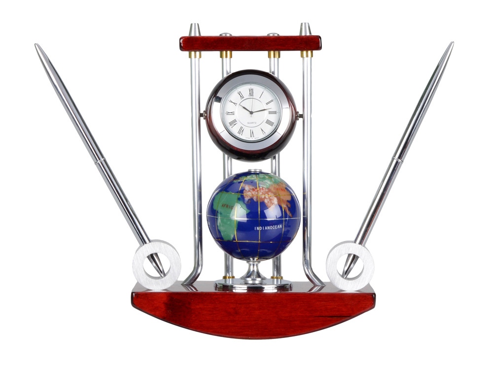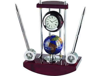 Настольный прибор «Сенатор» – образец делового аксессуара. Такой прибор можно разместить в офисе или личном кабинете. Он не только будет способствовать стильному оформлению обстановки, но и станет выполнять практические функции. В настольный прибор «Сенатор» входят две авторучки, которые удобно использовать на переговорах и совещаниях. Деревянную подставку аксессуара также украшают глобус и часы, которые помогут обладателю подарка оставаться пунктуальным.