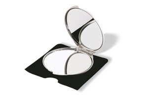Алюминиевое зеркальце со стандартным и увеличительным отражением в бархатном чехле.